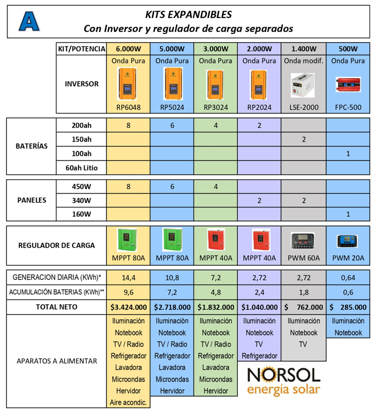 En las tablas A y B, cada columna corresponde a un KIT FOTOVOLTAICO con sus componentes: inversor, paneles, baterías y regulador de carga. Además se indica la Potencia máxima (W), Energía diaria (Kwh), Valor ($), y una referencia de los aparatos que puede alimentar. |